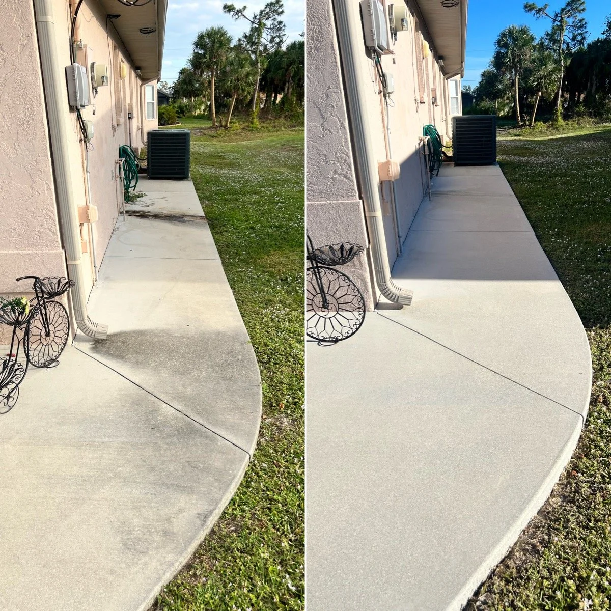 Pressure washing or soft wash of driveway to remove dirt, grime, and organic growth.