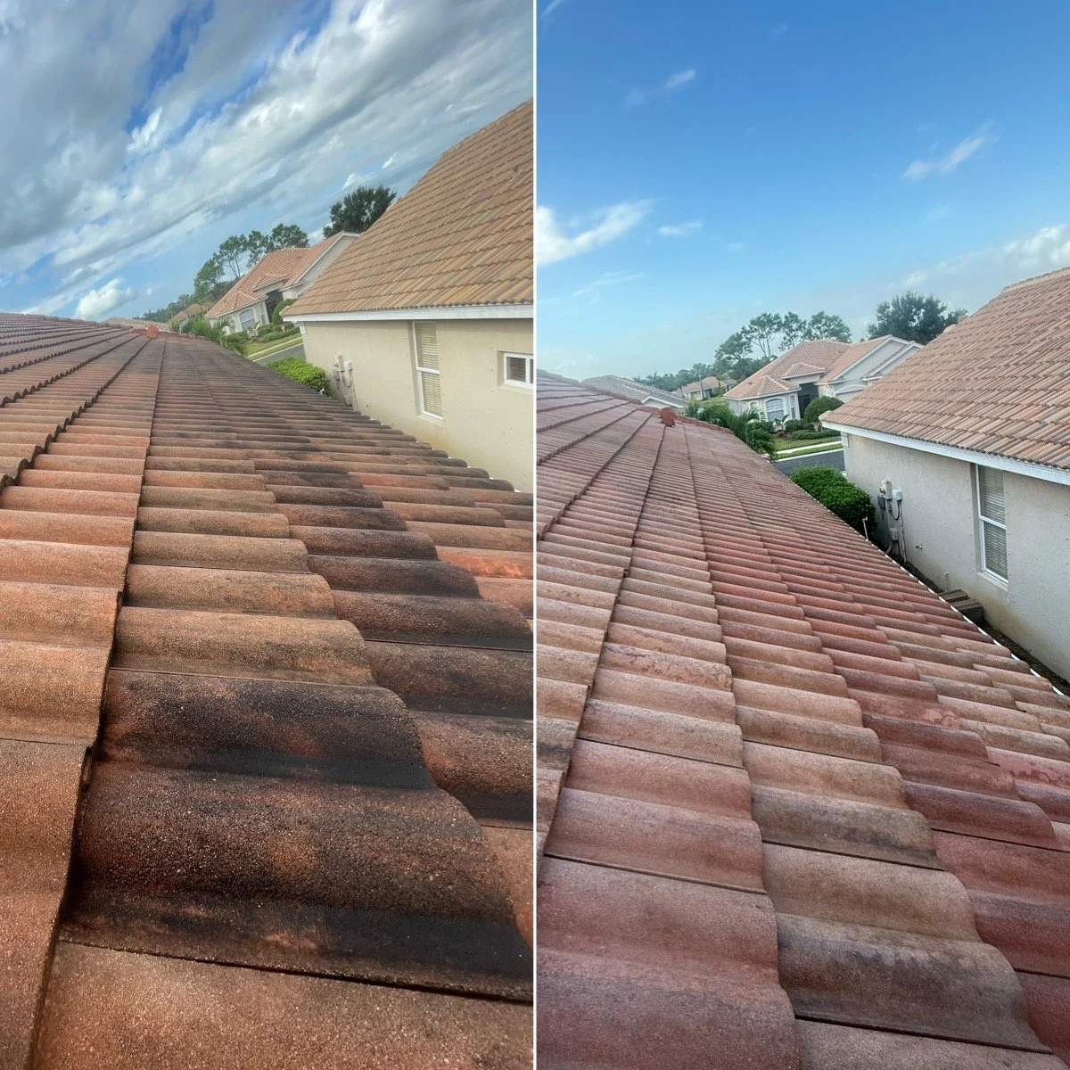 Our roof cleaning service uses a specialized soft wash system designed to safely and effectively remove black streaks, algae, mold, and buildup from tile, shingle, and metal roofs. Instead of using high pressure, our soft washing process relies on powerful, eco-friendly detergents that clean deeply without damaging your roofing materials. This gentle method restores your roof’s original color, helps prevent regrowth, and extends its lifespan — keeping your home looking beautiful and well cared for.