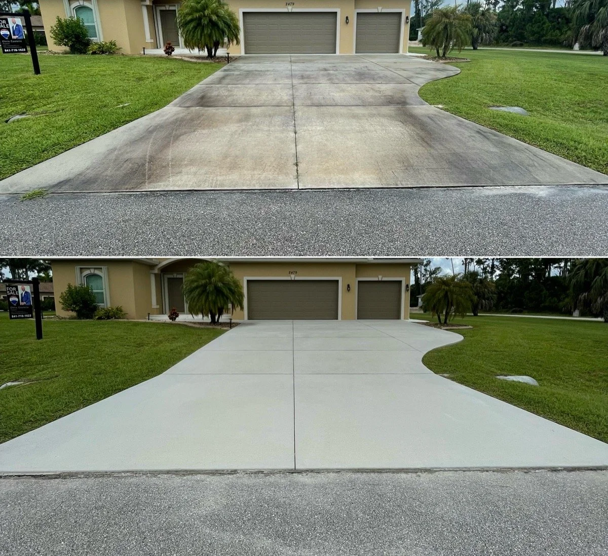 For tough, porous materials like concrete, we use an advanced process that includes a pre-treatment to break down deeply embedded stains, followed by the wash itself, and a post-treatment to inhibit the regrowth of mold and mildew, ensuring a cleaner surface for longer.